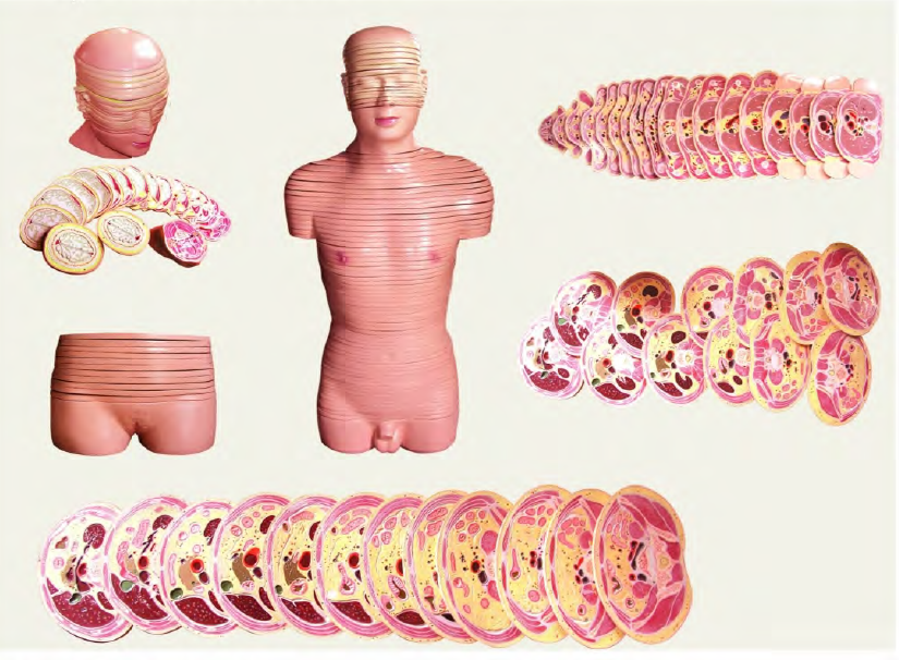 ■ 功能:顯示人體男女性水平斷面解剖模型結構和形態,將人體從頭頸部到盆部整個軀干分解成93片典型部分的結構,由頭頂部至坐骨結節作厚約10mm橫切片,男女盆腔部可互換;