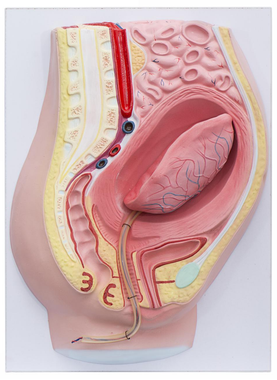 ■ 功能:本模型是胎兒娩出以后,宮腔體積及胎盆附著面減小時的女性腹、盆腔矢切面,顯示了此時子宮、陰道、胎盤及臍帶的形態(tài)結(jié)構(gòu)。胎盤的胎兒面及母體面形態(tài)逼真,子宮底部略向上,并繼續(xù)收縮,靠近恥骨聯(lián)合的下腹隆起,而露于外陰部的臍帶下垂(胎盤剝離征象)。隨后,胎盤中央部先剝離,且先降入子宮腔下段。由于胎盤的下降,周圍胎膜與子宮壁分開,胎盤附著面上流出物被包在胎盤與胎膜所形成的囊內(nèi),首先露出陰道外口是光滑的胎兒面, 隨之胎膜排出;