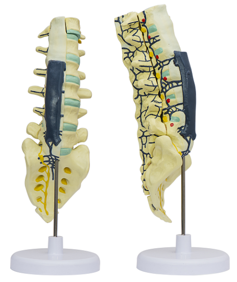 ■ 功能:顯示脊柱的腰屈和骶屈,剖開(kāi)一胸椎,示骨髓腔、骨松質(zhì)、骨密質(zhì)和椎間盤。在腰骶椎的背側(cè),顯示馬尾、終絲,同時(shí)還顯示部分腰神經(jīng),骶神經(jīng)穿椎間孔和骶前、后孔的情況及該部位的靜脈回流。顯示腰椎、骶尾椎的解剖特征和與該段脊神經(jīng)的位置關(guān)系;