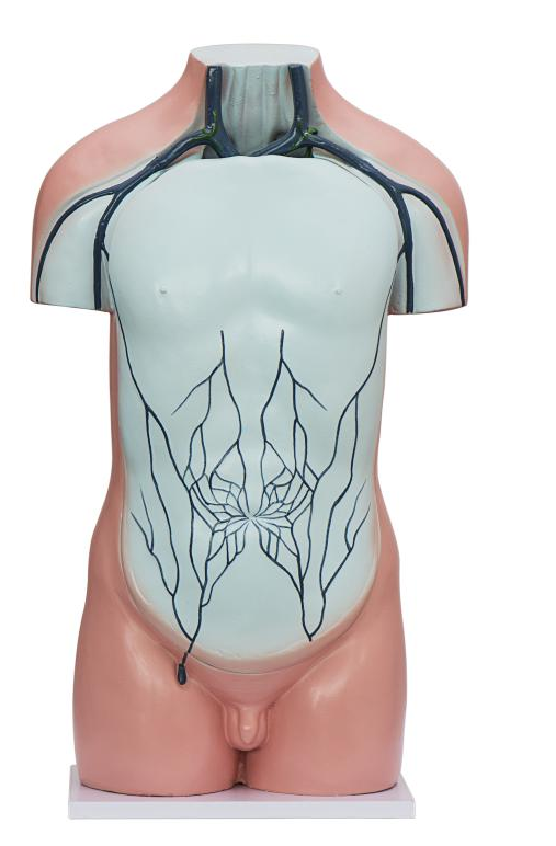 ■ 功能:產品上至頸根部作水平切,下至大腿根部、上肢于上三分之一橫切,打開胸腹壁,示門靜脈系的組成。軀干部示上腔靜脈,左右鎖骨下靜脈、頸內靜脈、頭臂靜脈、下腔靜脈、髂總靜脈及奇靜脈的斷段。腹腔內示肝、胃、腸、食管的部分外形。門靜脈系示各級屬支及屬支的配布。門靜脈系統主要示腸系膜上、下靜脈,脾靜脈,附臍靜脈,食管靜脈、胃左靜脈、胃右靜脈、膽囊靜脈、胰十二指腸后上靜脈等以及和門靜脈系有關的食管靜脈叢、直腸靜脈叢、臍旁靜脈叢、胸腹壁靜脈,腹壁上、下靜脈以及腹壁淺靜脈等;