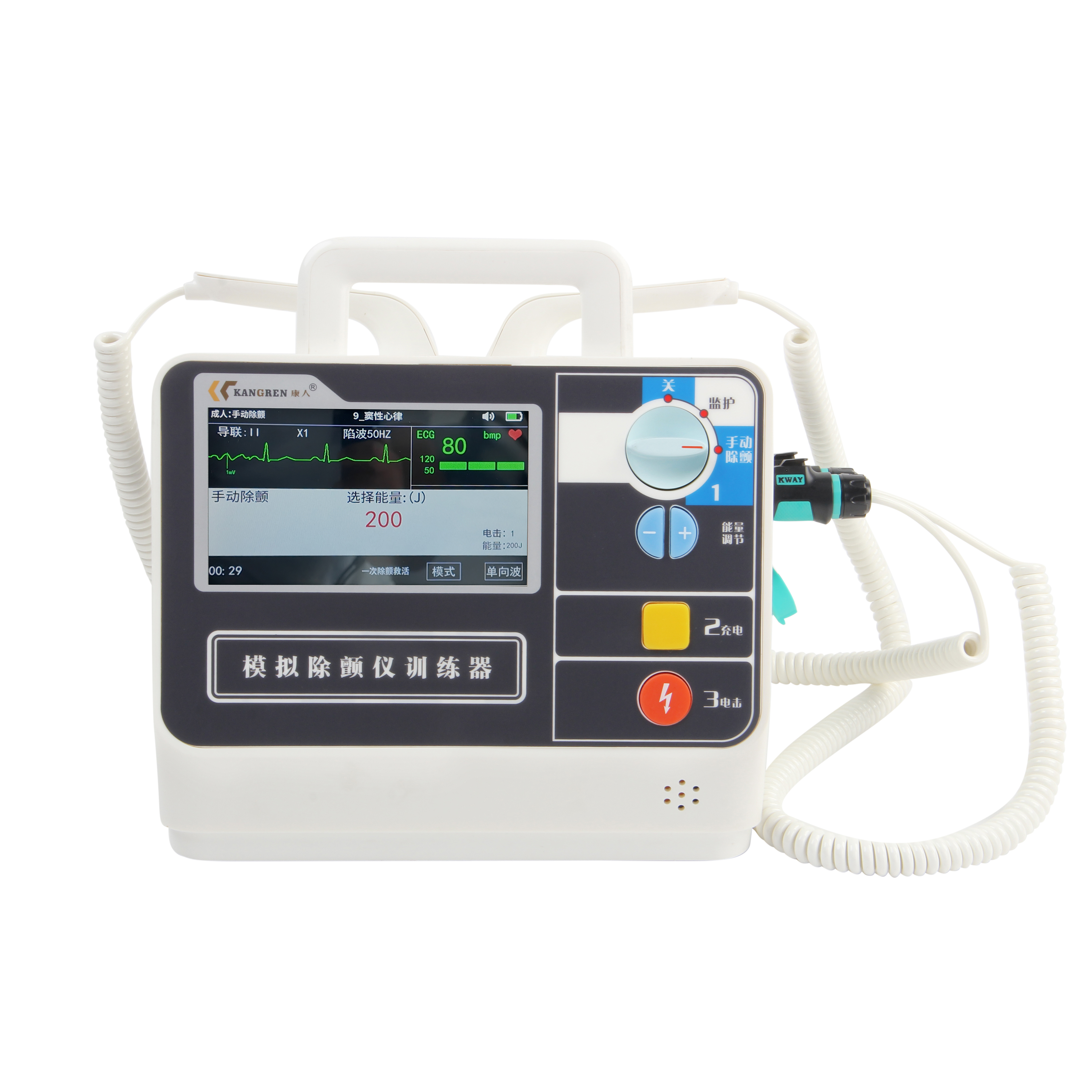 3) 旋鈕、按鍵與真實除顫儀功能相同,可選擇不同模式,實體按鍵可進行能量調節和充電、放電,操作過程中設備無高壓電流,可安全使